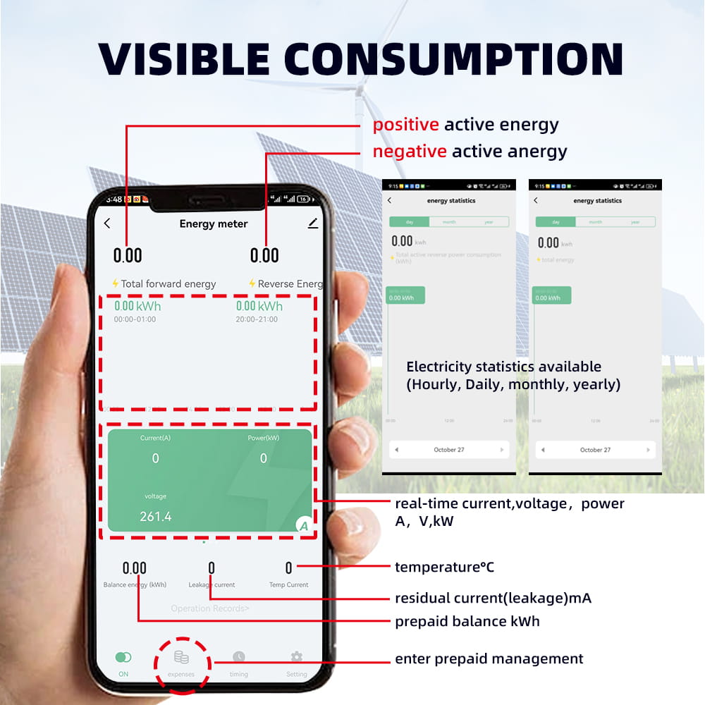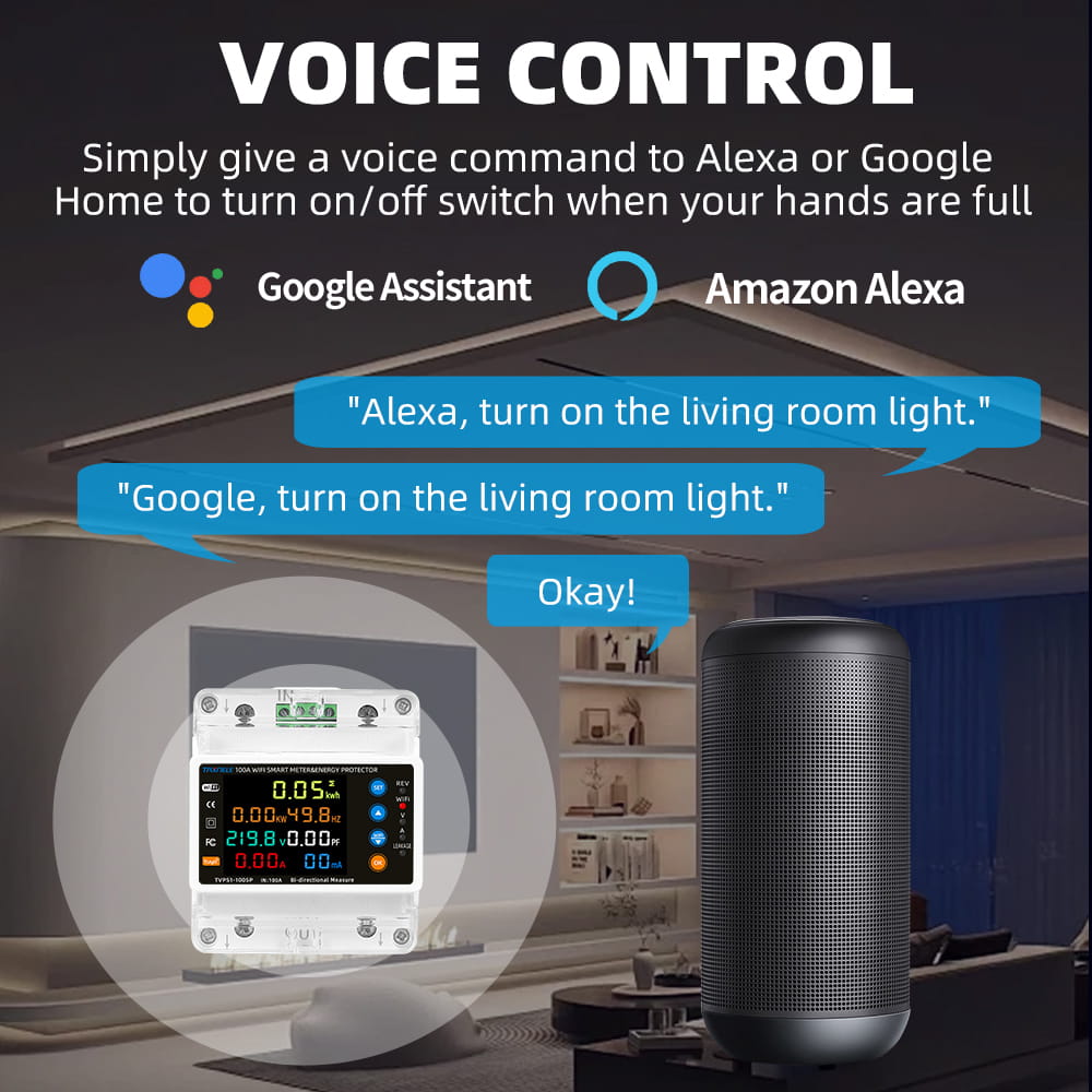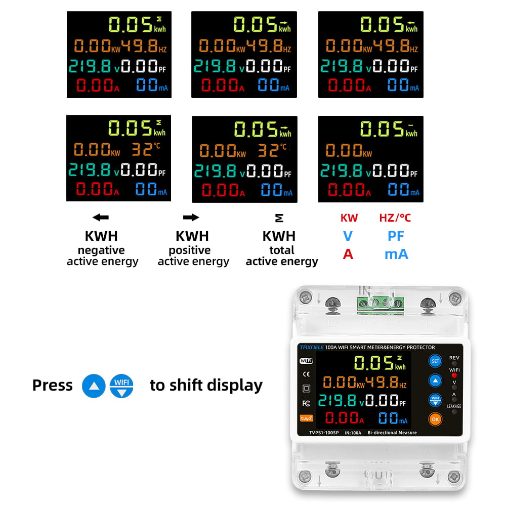 • Tuya WiFi smart bi-directional energy power meter with 2P 100A capacity, featuring kWh measurement, leakage protection, over/under voltage protection, relay control, and timer functions. Compatible with the Smart Life app for real-time monitoring and remote control of smart electrical systems.