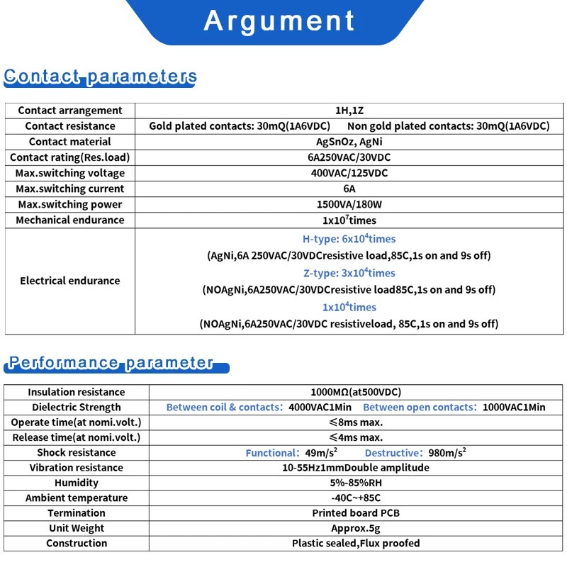Electrical endurance | H-type: 6×10⁴ times (AgNi, 6A 250VAC/30VDC resistive load, 85°C, 1s on and 9s off) Z-type: 3×10⁴ times (NOAgNi, 6A 250VAC/30VDC resistive load, 85°C, 1s on and 9s off) |
